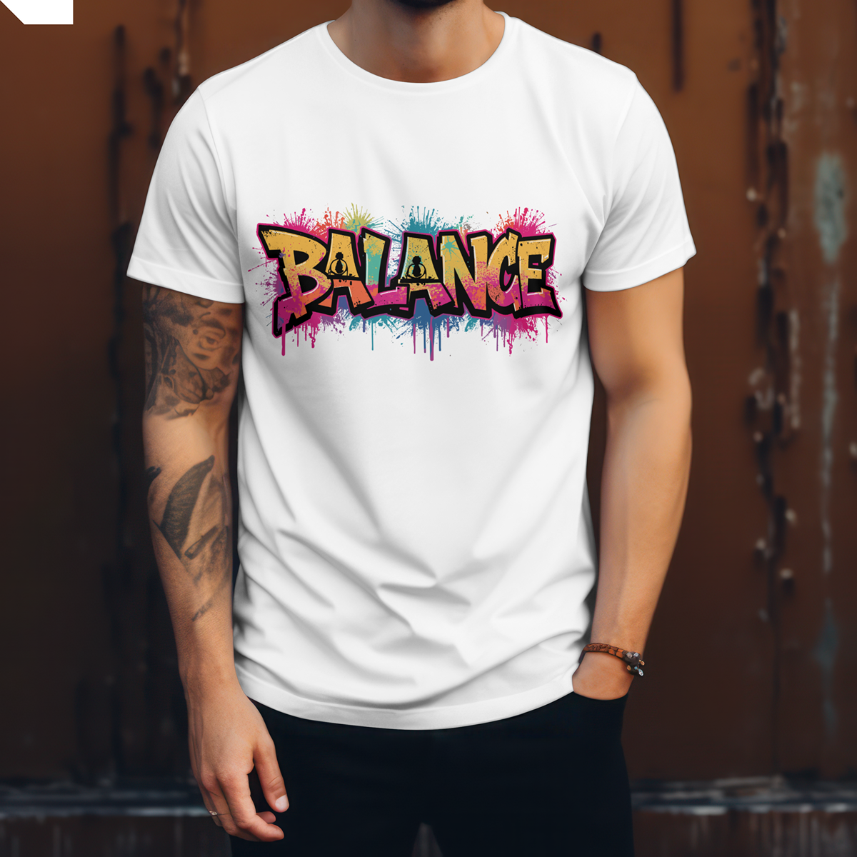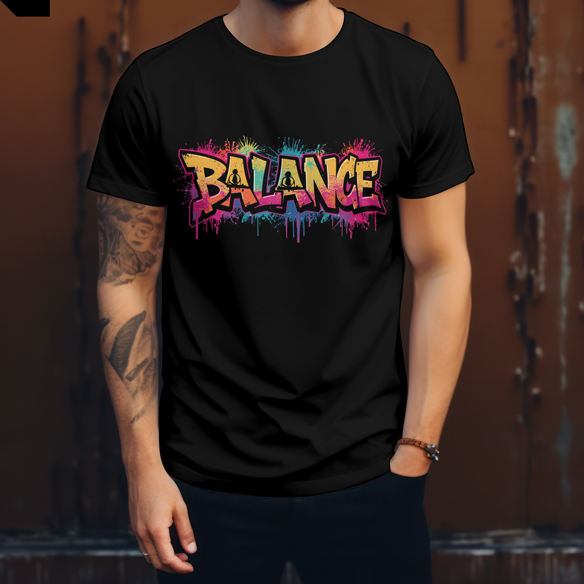BALANCE Street Art T-Shirt features bold graffiti-style “BALANCE” typography combined with vibrant paint splashes and layered urban spray textures. The colorful front graphic creates strong contrast and a high-impact streetwear look designed to stand out.