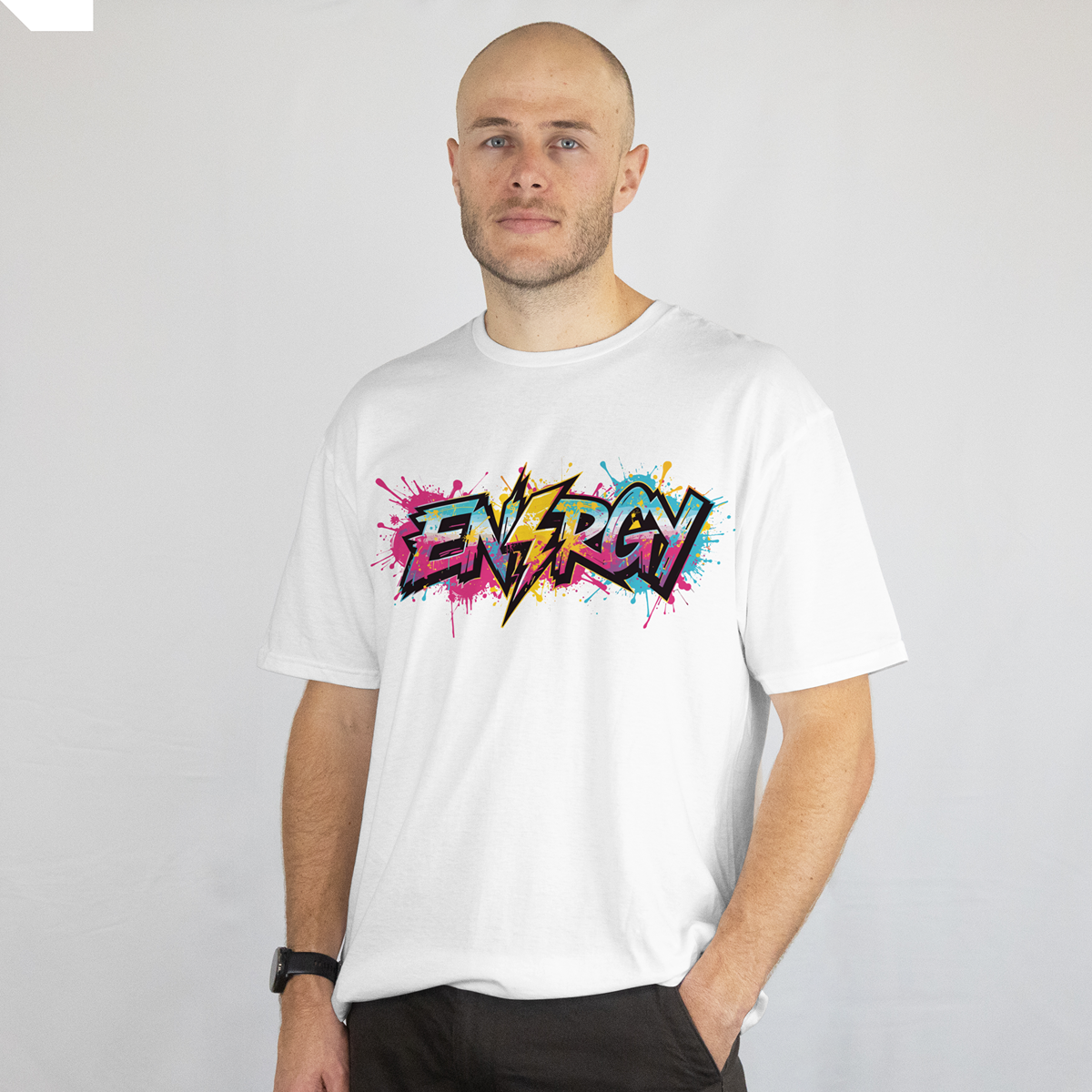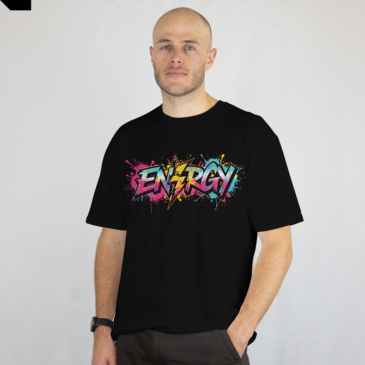 ENERGY Street Art T-Shirt features an explosive graffiti-style “ENERGY” typography highlighted with electric lightning elements and dynamic paint splashes. The bold front graphic delivers a powerful visual impact and an energetic streetwear aesthetic built to stand out.