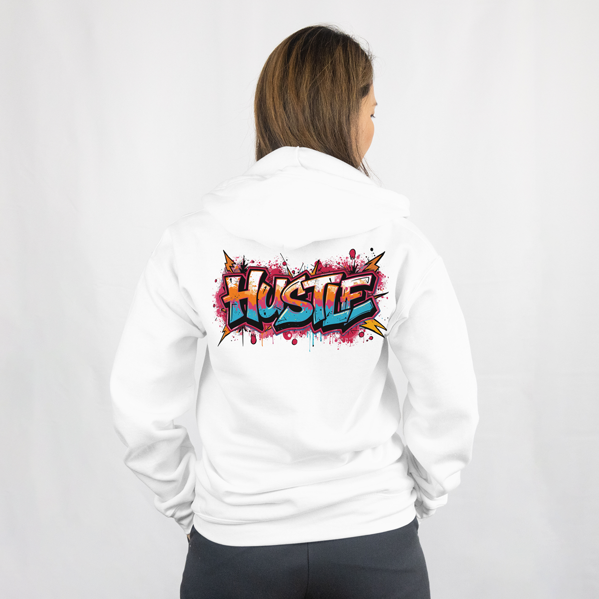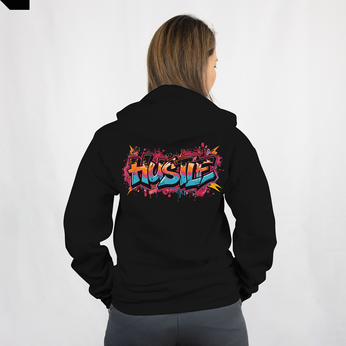 HUSTLE Street Art Hoodie features a bold graffiti-style back print with vibrant color splashes and sharp urban lettering. The large rear graphic delivers strong visual impact and creates a modern streetwear look designed for everyday wear and layering.