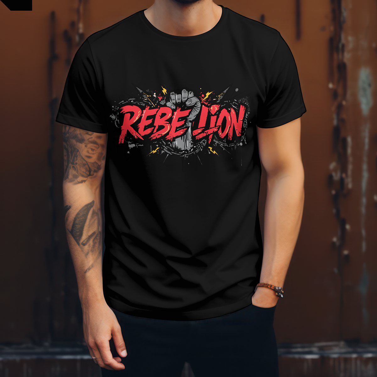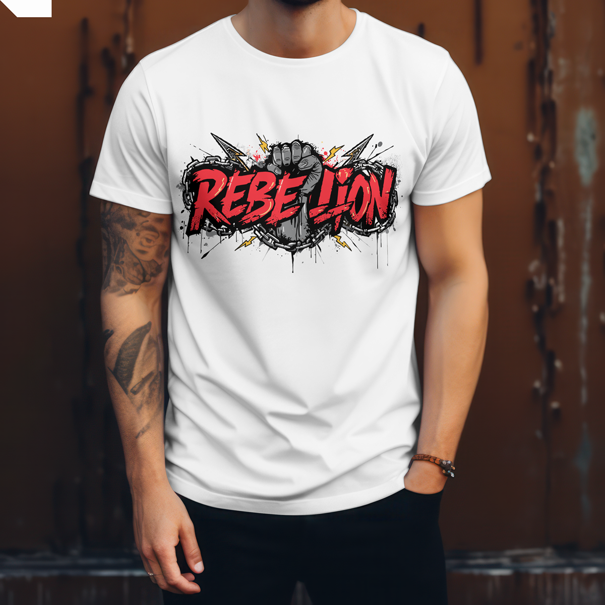 REBELLION Street Art T-Shirt features a bold graffiti-style front print with a raised fist centerpiece, broken chain elements, and high-contrast urban textures. The dynamic composition delivers a strong visual impact and a modern streetwear look designed to stand out.