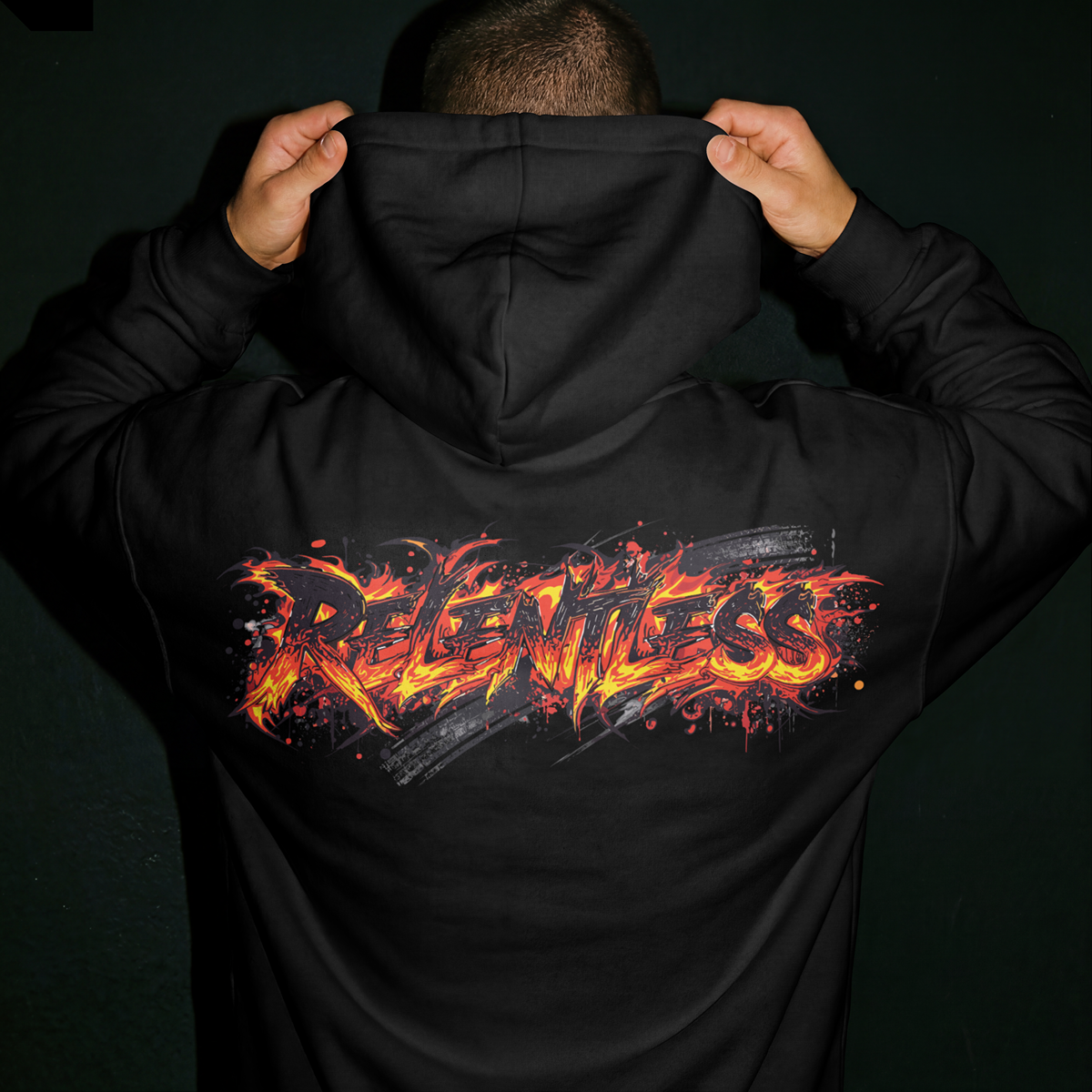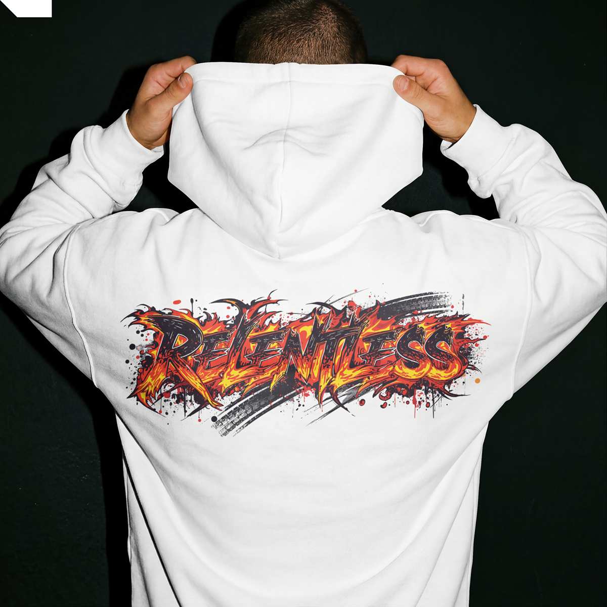 RELENTLESS Street Art Hoodie features a powerful flame-inspired graffiti typography combined with dynamic brush strokes and intense fire textures. The bold back graphic delivers high-impact visual energy and a strong streetwear attitude built for standout urban style.