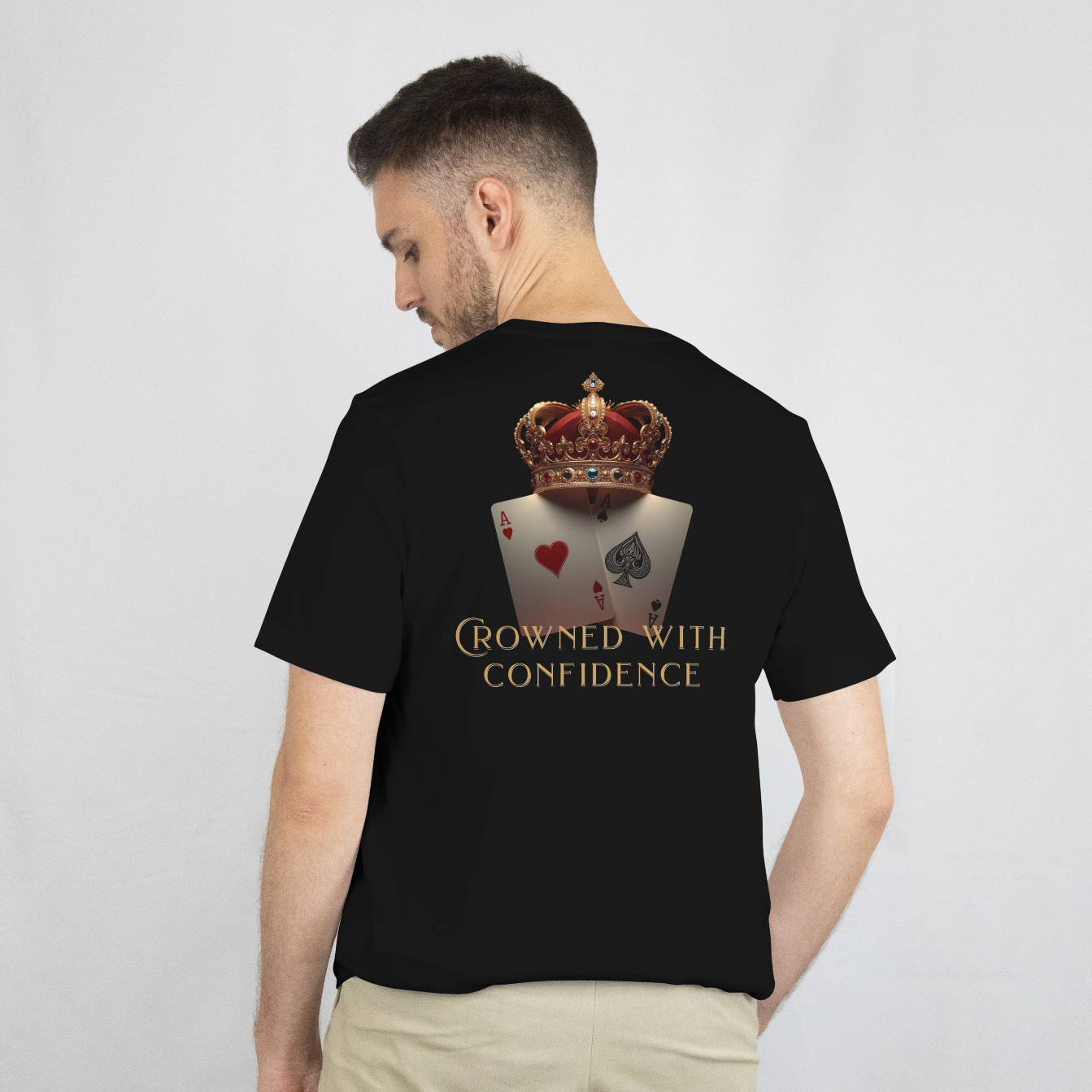 The Crowned With Confidence T-shirt is designed for those who carry themselves like royalty. Featuring a bold back graphic with a royal crown and playing cards, this design symbolizes power, self-belief, and owning every move you make.